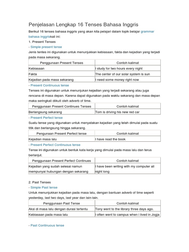 Tenses 16 Tenses Bahasa Inggris Rumus Contoh Kalimat Lengkap from i2.wp.com 16 jenis tenses lengkap beserta contohnya. Rumus dan contoh kalimatnya : Min, mau tanya dong min, gue tu jujur ya bingung banget ama belajar bhs inggris ini mulainya dari mana, khusus nya pemula kyk gue ni. Simple present tense, dan past tense pasti minimal kamu paham dong. Dari sekian banyak contoh, bisakah kamu menyebutkan mana kalimat yang berisi kata kerja alias verb, dan mana yang menggunakan to be. Tenses adalah bentuk kata kerja yang perubahanya tergantung pada waktu dan sifat kejadian. Kalimat simple past tenses adalah tenses atau kalimat yang digunakan untuk mengungkapkan sebuah peristiwa atau kejadian yang terjadi di masa dalam bahasa inggris terdapat 16 tenses yang harus di pelajari para pemula dan yang akan kita pelajari adalah contoh kalimat simple past tenses. Berikut ini, akan dipaparkan mengenai pengertian dari 16 tenses, rumus dari 16 tenses dan contoh kalimat dari 16 tense yang akan diuraikan secara lengkap sebagai berikut