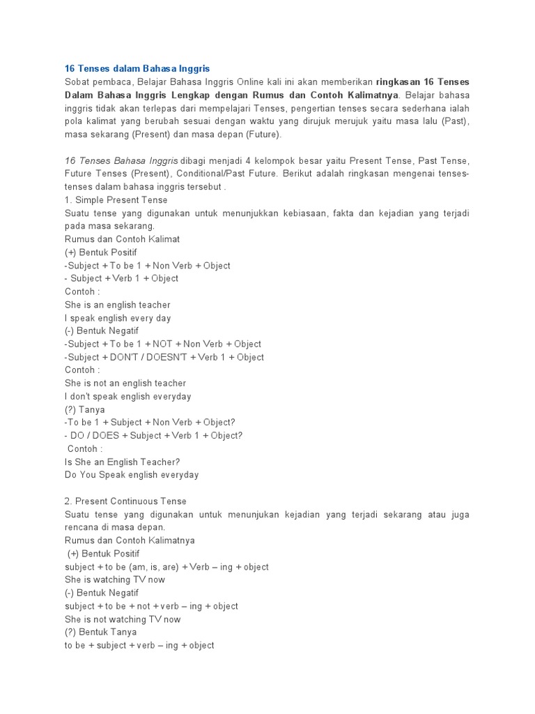 Macam, penggunaan, rumus dan contoh kalimat 16 macam tenses bahasa inggris: Rumus simpel past tense positif. 16 tenses dan contoh kalimat positif, negatif dan tanya tentu akan melibatkan pola kalimat yang perlu diketahui. Mulai dari rumus sampai contoh. Kalimat positif simple present tense menggunakan verb 1 (kalimat verbal) atau to be are/am/is (kalimat nominal).